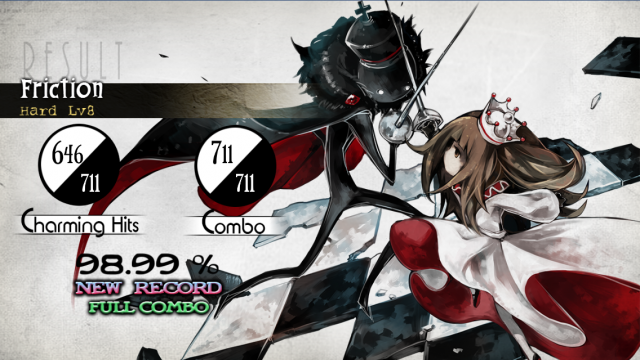 Frictionは繋がってるけど99%切る微妙な成績なもんで、そのうち詰め直すと思う。 スライドとタップ複合の練習になるし曲もいいから意識して詰めなくても練習してるうちに伸びると信じている。 |