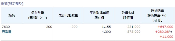 大学時代に頑張って買った231,000円が評価額だけで878,000円になってる。